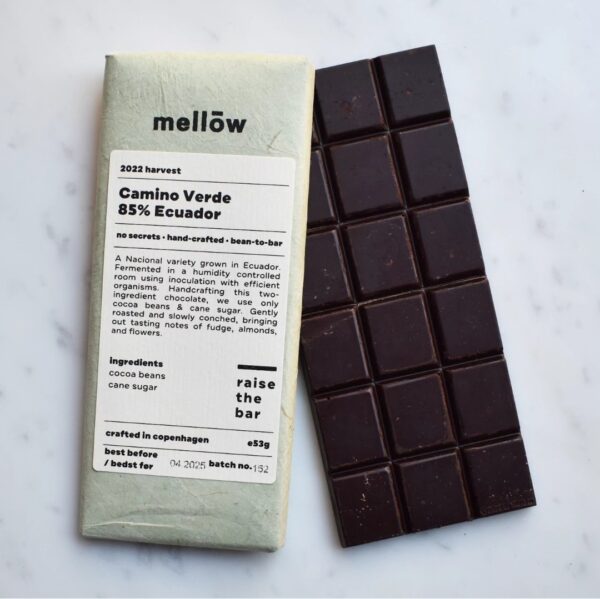 Mellow is a bean to bar chocolate maker from Denmark. This fine chocolate bar is made with cocoa from Ecuador (Camino Verde). Mellow Ecuador Camino Verde 85% is a dark chocolate with a bitter taste, with floral aromatic notes, roasted almonds, chicory, roasted bread crust, tea.