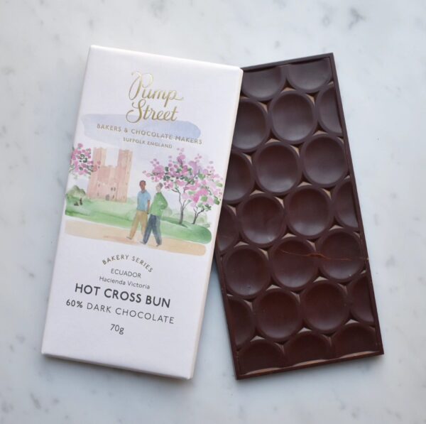 A welcome addition to our Bakery Series of bars heralding Spring and the beloved Pump Street baked good; the hot cross bun. Our Ecuador Hot Cross Bun 60% is made with cocoa from Hacienda Victoria in Ecuador and our bakery signature hot cross buns, scented with nutmeg, cloves and cinnamon. The bar is then, like the buns, studded with currants.