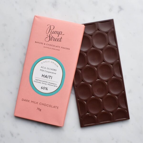 Made with single-origin cocoa beans from northern Haiti, this dark milk chocolate is a bold twist on tradition – offering the deeper flavor of dark chocolate with the lush texture of milk. It’s a bar that showcases the unique character of Haitian cacao: bright, warm, and unmistakably vibrant.