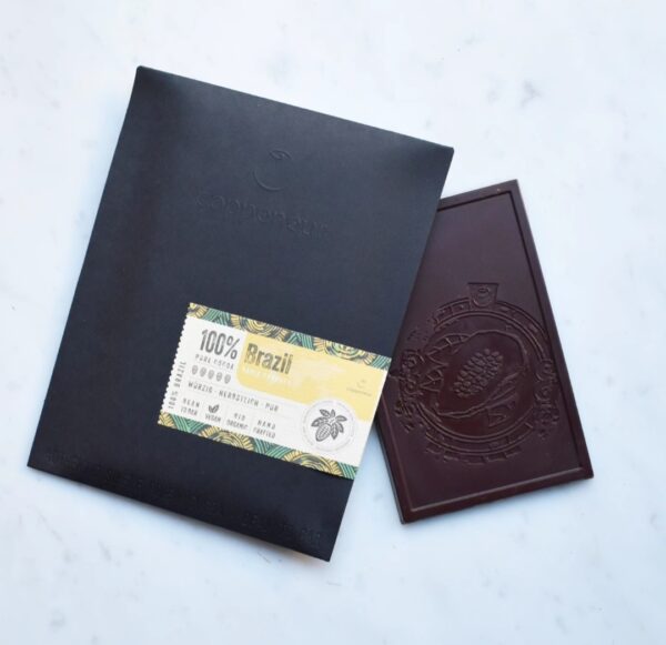 Coppeneur è un produttore bean to bar della Germania. Questa tavoletta è prodotta con cacao pregiato del Brasile. Coppeneur Brasile 100% è un cacao dal gusto gradevolmente acido con note aromatiche di pompelmo, arancia rossa, mirtilli, nocciola tostata, caffè, spezie.