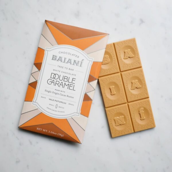 Chocolate Branco é Chocolate? Na Baianí a resposta é sim, porque usamos a manteiga extraída do cacau da nossa fazenda nas receitas. Caramelo é uma paixão cheia de bossa, então resolvemos duplicar a experiência caramelizando não só o açúcar como também o leite em pó, trazendo o sabor sofisticado de um doce de leite cremosíssimo.