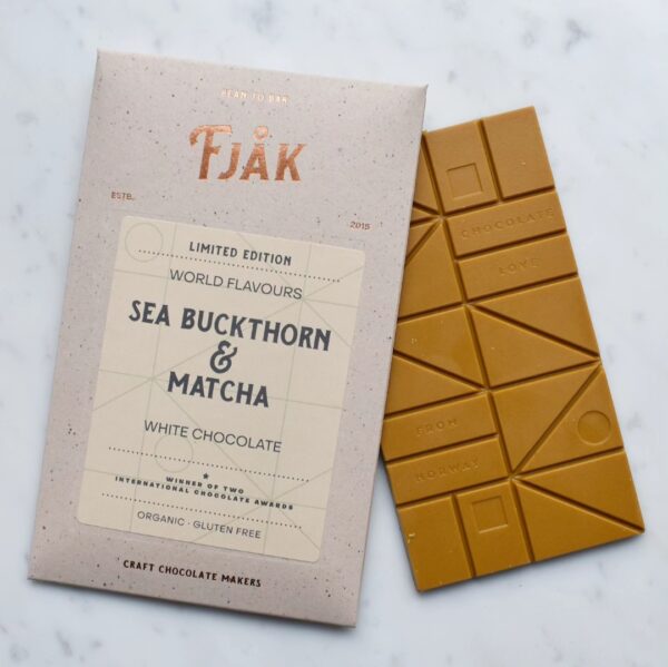As part of our ‘World Flavours’ series we have created a very special ‘double-sided’ flavour bar, where Norway meets Japan. One side sings with the mellow, sweet nuttiness of traditional Japanese matcha tea, the other, contrasting in colour and flavour, with the tangy, citrus sweetness of Nordic sea buckthorn. When flavours collide, magic can happen.