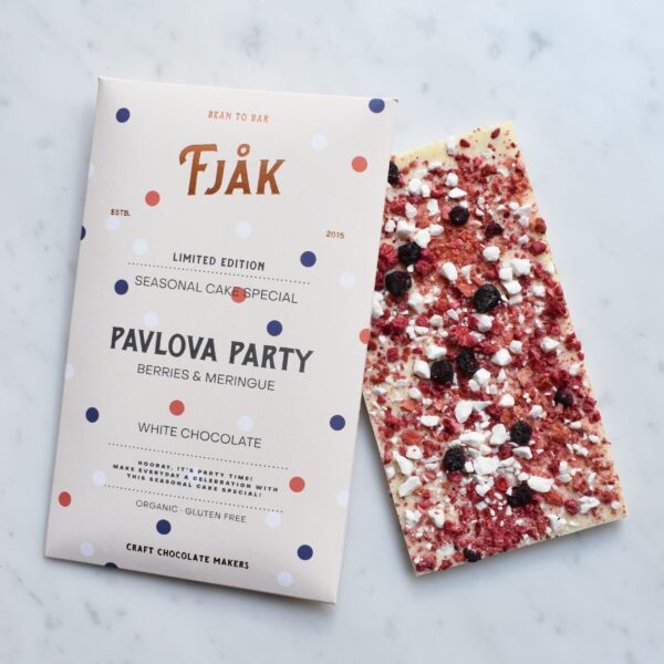 Our Pavlova party bar is a creamy merengue white chocolate topped with dry merengue and Nordic berries, blueberries, raspberries and strawberries. The colour of the fresh berries are the perfect combination of the Norwegian flag.