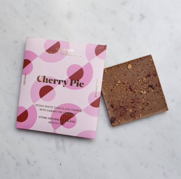Goodio è un produttore bean to bar della Finlandia. Goodio Torta di ciliegie – Cioccolato bianco vegano è una tavoletta di cioccolato bianco vegano, dal gusto dolce, con note aromatiche di ciliegia, caramello salato, biscotto all’avena, cannella.