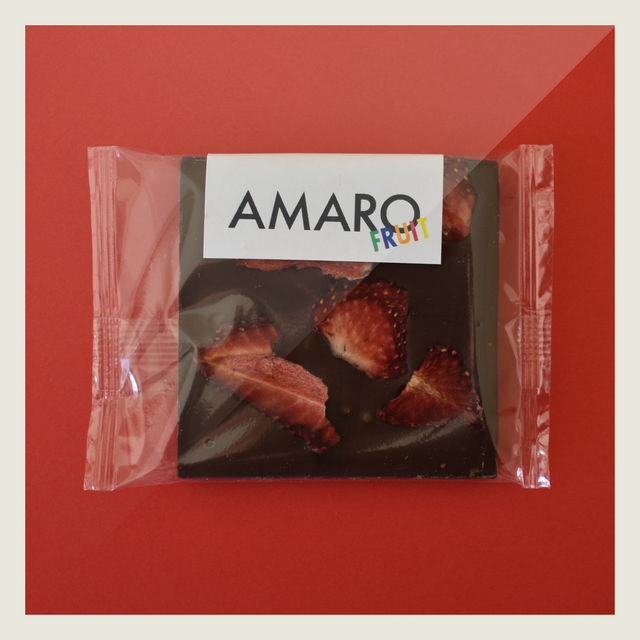 Amaro, è un produttore bean to bar italiano. Amaro fruit fragole 66% è un cioccolato fondente finissimo con fragole disidradate