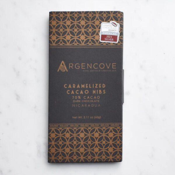 Argencove è un produttore bean to bar del Nicaragua. Questa tavoletta di cioccolato finissimo, è prodotta con cacao del Nicaragua. Argencove Nicaragua cioccolato fondente 70% con fave di cacao caramellate è un cioccolato fondente, dal gusto gradevolmente dolce, con note aromatiche di limone. mirtilli, more, nocciola, caramello, caffè.