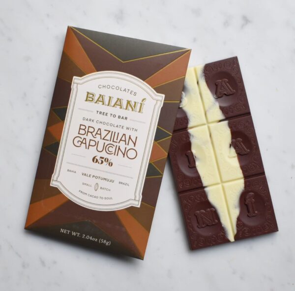 Baianì chocolates è un produttore bean to bar del Brasile. Questa tavoletta di cioccolato finissimo, è prodotta con cacao del Brasile (Bahia, Vale Potumuju). Baianì chocolates Brasile cioccolato fondente 65% e bianco con caffè, è un cioccolato fondente e bianco con caffè, dal gusto dolce, con note aromatiche di panna e caffè.