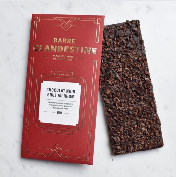 Des éclats de fèves de cacao Maya Mountain, infusés au Rhum Copalli blanc, apportent croquant et puissance aromatique à notre chocolat grand cru aux notes de miel et d’ananas.