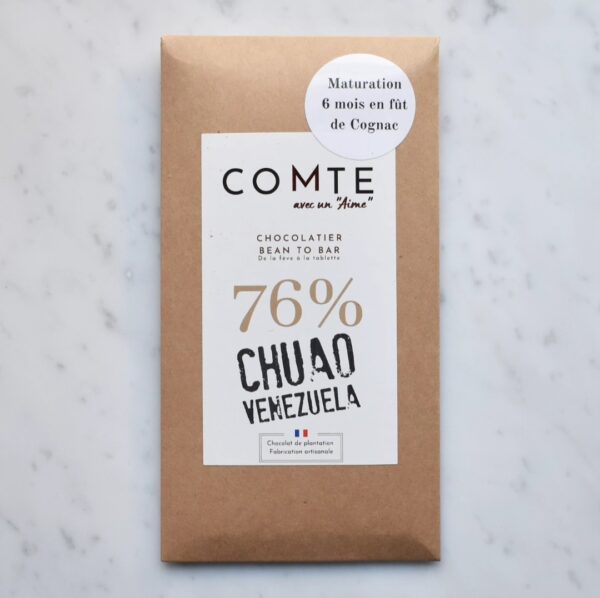 COMTE è un produttore bean to bar della Francia. Questa tavoletta di cioccolato finissimo, è prodotta con cacao del Venezuela (Chuao). COMTE Venezuela Chuao cioccolato fondente 76% invecchiato 6 mesi in botti di Cognac è un cioccolato fondente equilibrato, con note aromatiche di arancia, ciliegia, lampone, prugna, burro, liquirizia, cognac