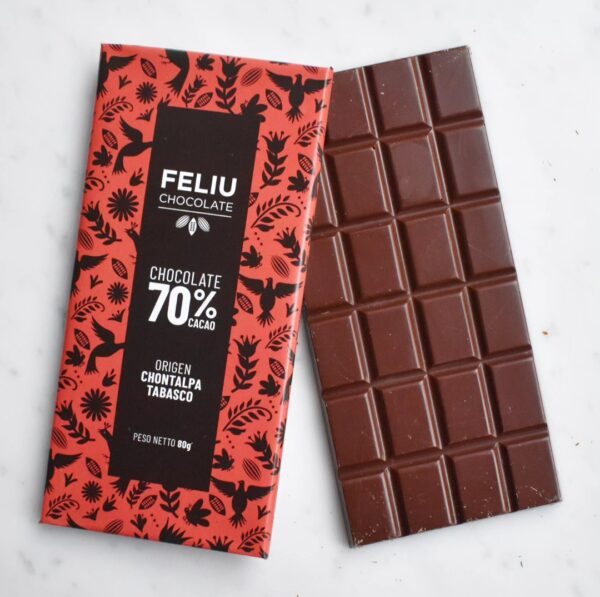 Feliu chocolate è un produttore bean to bar del Messico. Questa tavoletta di cioccolato finissimo, è prodotta con cacao del Messico (Tabasco, Chontalpa). Feliu Messico Tabasco Chontalpa 70% è un cioccolato fondente dal gusto equilibrato, con note aromatiche di miele, pompelmo, lampone, ciliegia, more, albicocca essiccata, pepe.