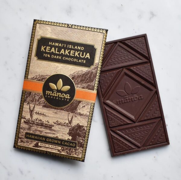 About the Bar: Located on the west side of Hawaiʻi Island (the Big Island), Kealakekua is hot and dry. Normally, cacao trees would be unable to survive the harsh lava field conditions, but with irrigation they thrive. The cacao of this chocolate bar is farmed, fermented and dried by the Hard Rock Gardens Estate in Kealakekua.