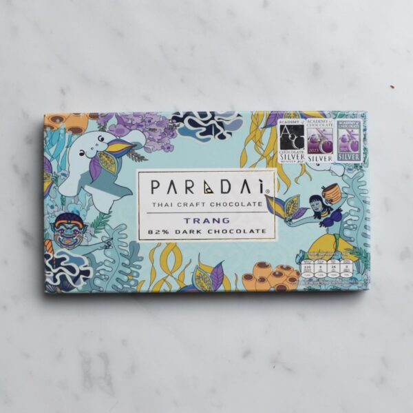 Paradaì è un produttore bean to bar della Thailandia.. Questa tavoletta di cioccolato finissimo, è prodotta con cacao della Thailandia (Trang). Paradaì Thailandia Trang fondente 82% è un cioccolato fondente dal gusto gradevolmente dolce, con note aromatiche di miele, mandarino, banana, mango, papaya, ciliegia, anacardo, nocciola, uvetta, legno dolce.