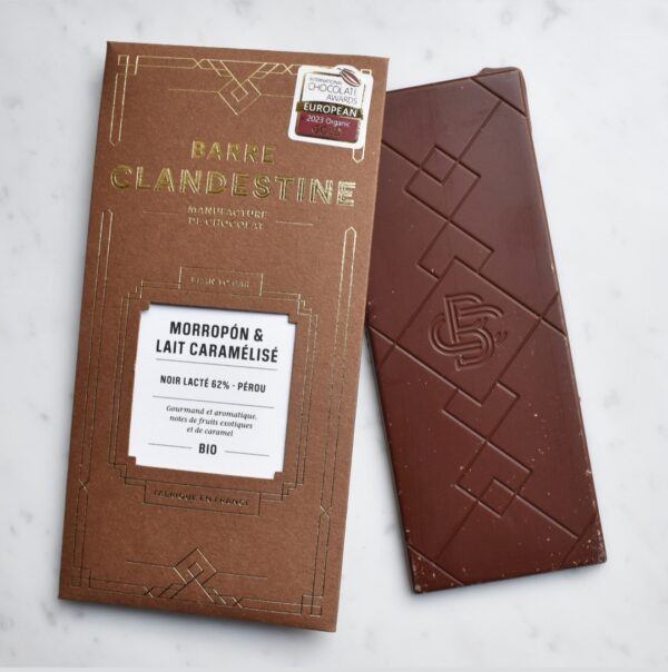 Hors des sentiers battus, ce “noir lacté” est inclassable : à mi-chemin entre un chocolat noir et un chocolat au lait. Dans notre manufacture, les fèves sont torréfiées à chaleur douce, broyées lentement à la meule de pierre et maturées plusieurs semaines. Une touche de lait caramélisé apporte rondeur et gourmandise à cette fève d’exception du terroir de Morropón, au Pérou.